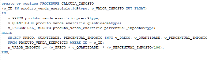 Crie uma procedure que, dado um identificador da venda (ID ), da tabela PRODUTO_VENDA_EXERCICIO, temos como retorno o valor financeiro do imposto. O parâmetro referente ao resultado do imposto deve ser passado para essa procedure como um parâmetro OUT.