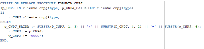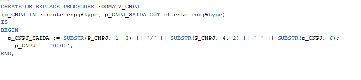 A variável v_CNPJ é utilizada como uma cópia de p_CNPJ, permitindo que a procedure manipule e modifique o valor do CNPJ sem alterar o valor original passado como entrada. No exemplo, ela é usada para fins de demonstração, atribuindo o valor ‘0000’, mas em um cenário real, poderia ser usada para outras transformações