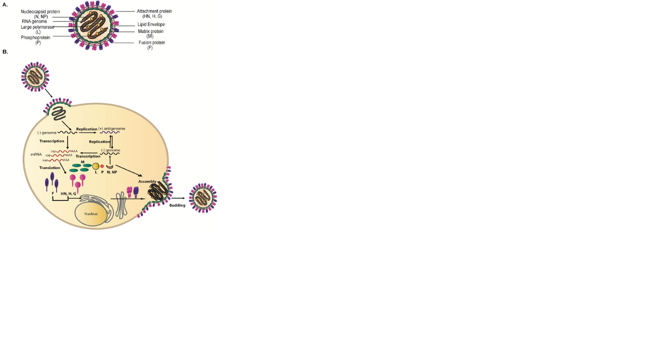 1) RNA de sentido negativo envelopado 2) Virions de replicação no citoplasma