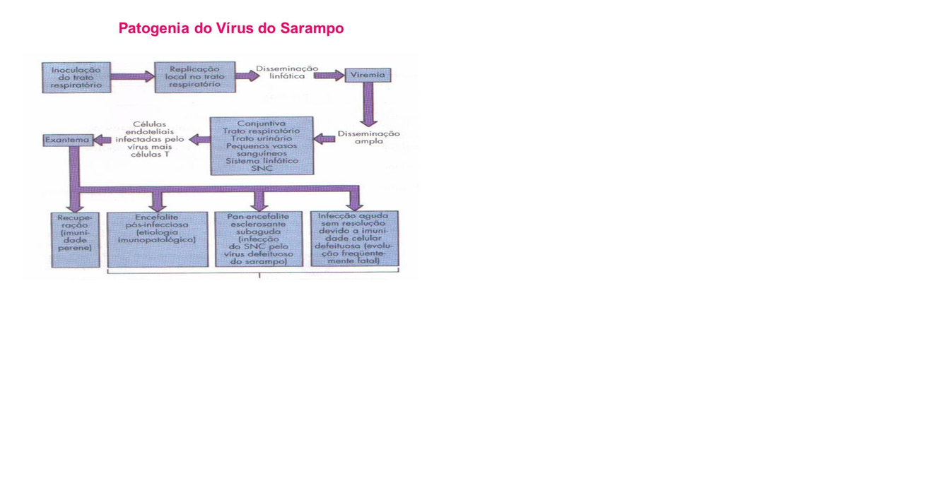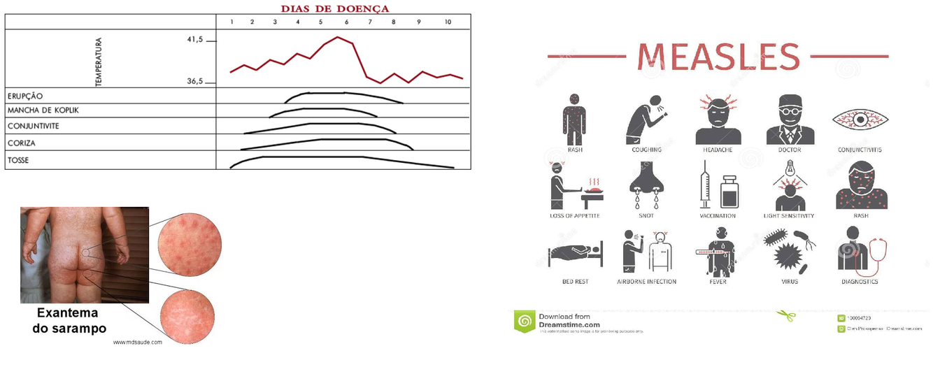 O vírus infecta células epiteliais do trato respiratório, se dissemina de forma sistêmica nos linfócitos e por viremia, se replica na conjuntiva, TGU, vasos sanguíneos e SNC. O exantema é causado pela resposta imune das células T às células epiteliais infectadas pelo vírus que revestem os capilares. O vírus provoca imunossupressão e a imunidade celular é essencial no controle da infecção Transmissão: aérea