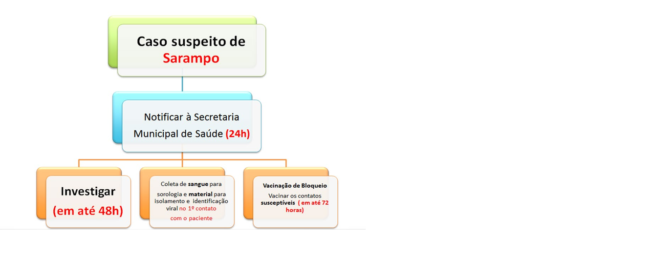 1)7-13 dias de incubação e pródromo: tosse, coriza, conjuntivite e fotofobia 2)Após 2 dias: Manvhas de Koplik 3)Depois de 12 a 24 horas: exantema atrás da orelha que se espalha para todo o corpo