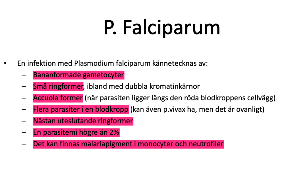 En infektion med Plasmodium falciparum kännetecknas av: