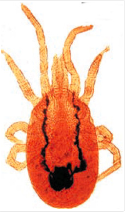 Knemidocoptes mutans is also known as the “scaly leg mite” and affects chickens, pheasants, and pigeons. It causes lesions primarily on the legs and unfeathered parts although irritation can lead to feather picking. The lesions progress to appear thickened and encrusted. The adult females are short legged, round, up to 0.5mm in diameter.