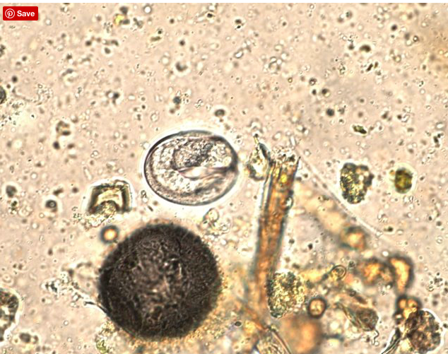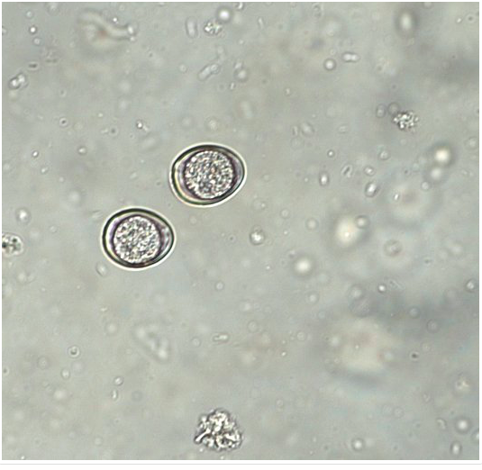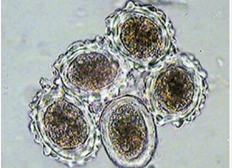Moniezia eggs are rectangular (as shown) or triangular. Moniezia is an anoplocephalid tapeworm found in young cattle. Their life-cycle involves oribatid mites which live in the soil and are ingested by the host. Moniezia are generally considered non-pathogenic but may cause intestinal stasis.