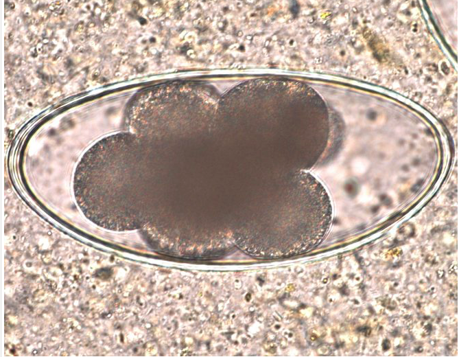 This image shows a Strongyloides westeri egg. Strongyloides pass from the host in the larvated form and are recognizable as an oval-shaped, thin-shelled embryonated egg.