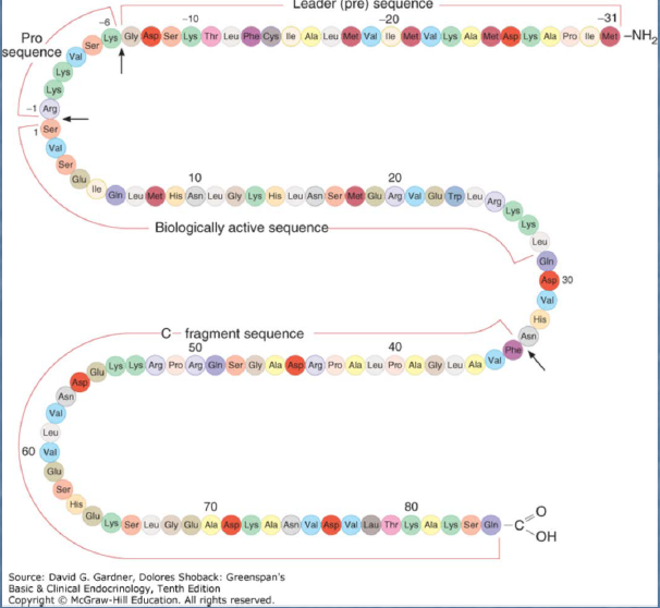 Au départ, la pré-pro-PTH (115 a.a.) est transformée par le retrait d’un segment pré-PTH en pro-PTH (90 a.a.). Finalement, le segment de la pro-PTH est éliminé, ce qui laisse le PTH (84 a.a.)
