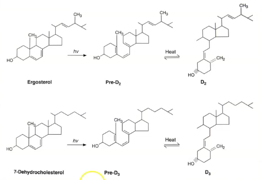 Le 7-Dehydrocholestérole au niveau de la peau, sous l’effet des rayons UV du soleil, est transformé en Pré-D3, qui elle sous l’effet de la chaleur est transformée en en vitamine D3