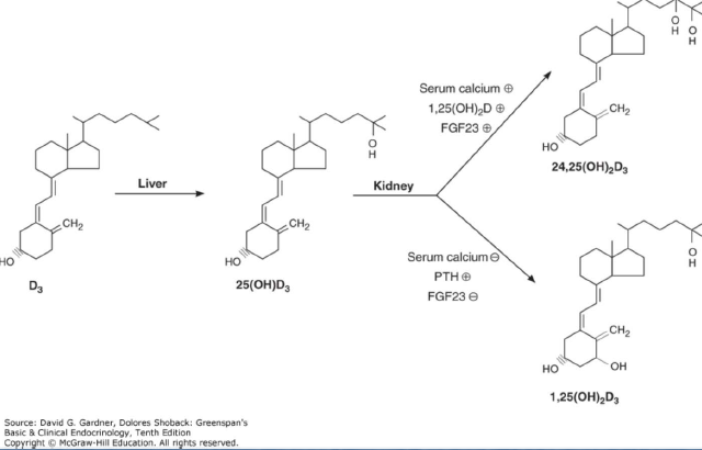 La vitamine D2 (ou D3) est convertie au niveau du foie en 25(OH)D2, qui au niveau du rein est convertie par la 1-alpha hydroxylase en 1,25(OH)2D2