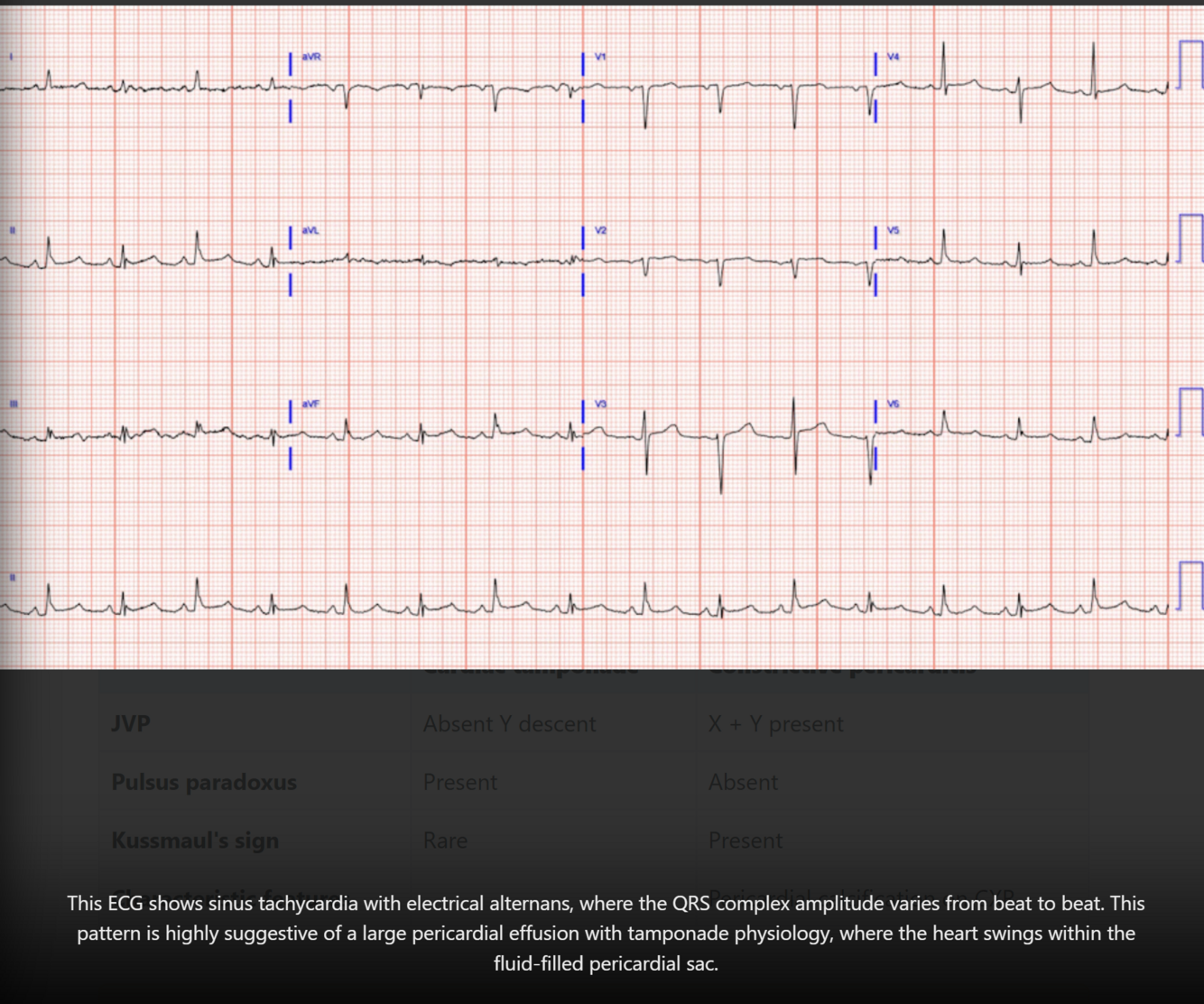 ECG: electrical alternans (where the QRS complex amplitude vary from beat to beat)