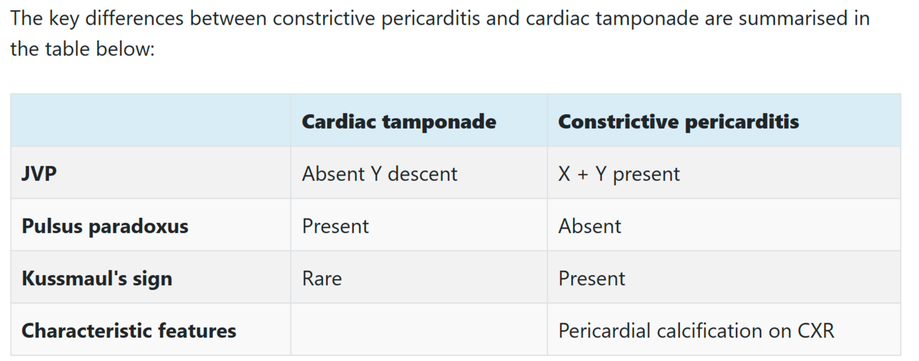 Differences between constrictive pericarditis and cardiac tamponade