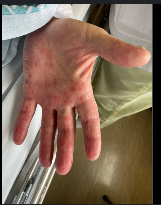 Non-tender macules on palms and soles, more associated with acute onset
