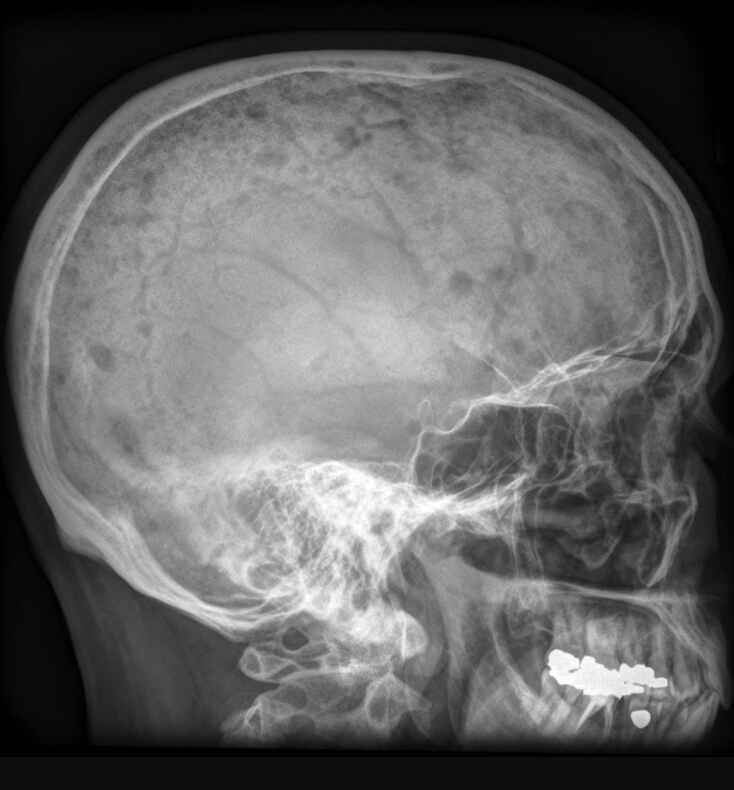 Patient is a 60 year old male has and has been complaining of pain, unexplained weight loss and recurrent respiratory infections. You take this xray and labs. Elevated ESR and M spike. What are the findings? Diagnosis?