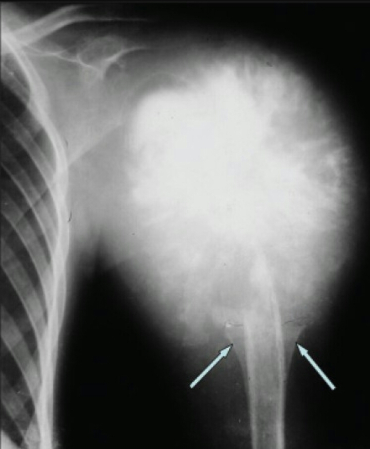 Sunburst periosteal reaction, dense sclerotic lesion at the proximal aspect of the humerus in the metaphyseal region, Codman triangle