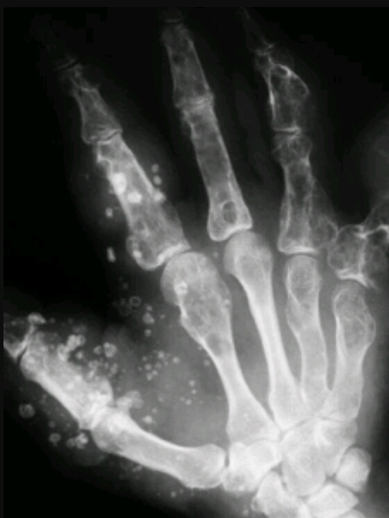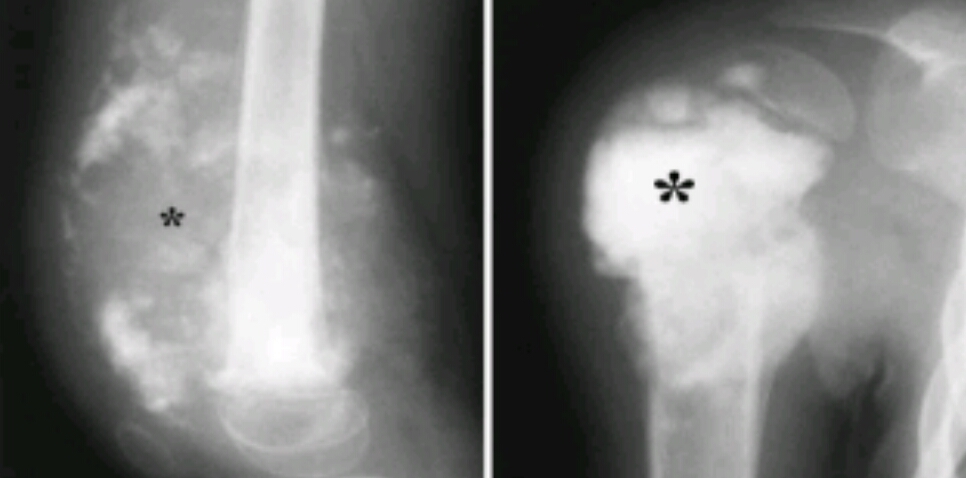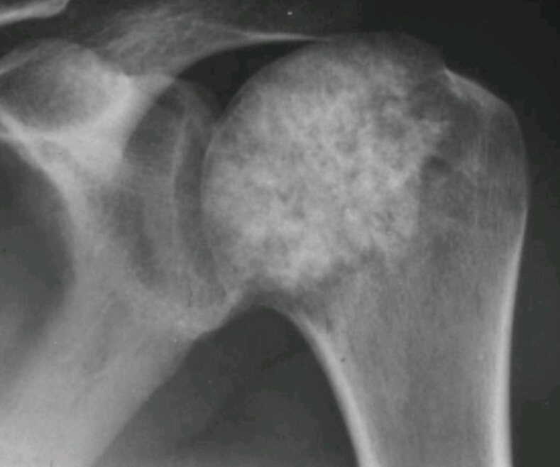 Stippled calcifications, popcorn like density, round oval area of demineralization, lytic destruction of proximal humerus
