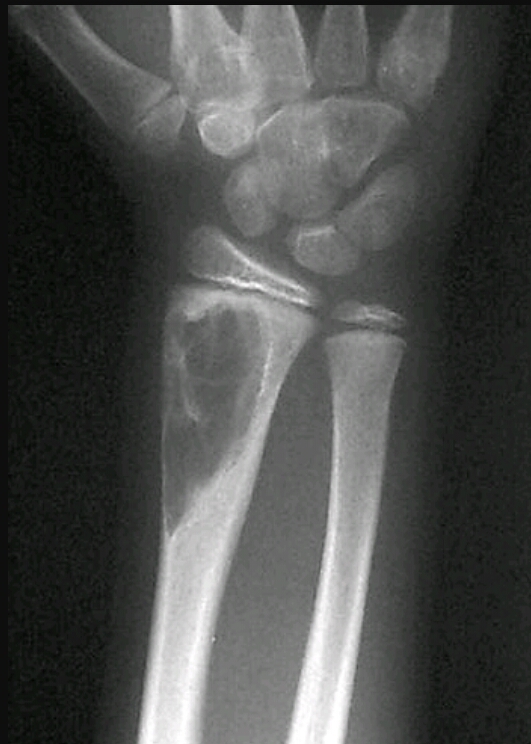 Round lyrics lesion 1-2cm in diameter, well defined sclerosis margin, eccentric and metaphyseal