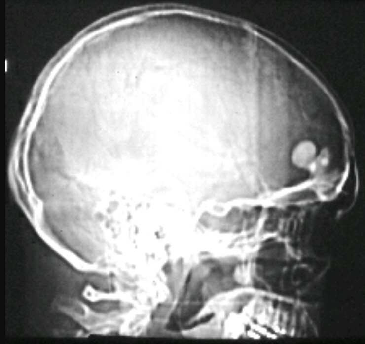 Well circumscribed round extremely dense lesion around 2cm in size in the frontal bone
