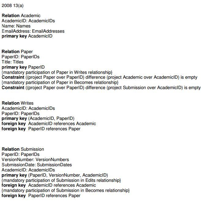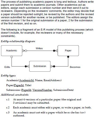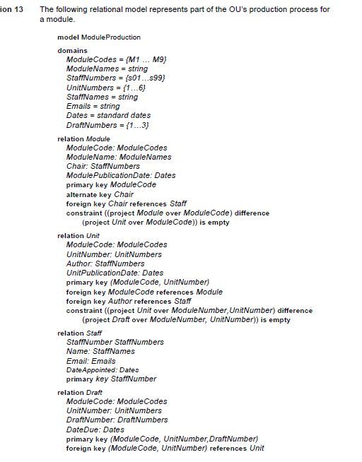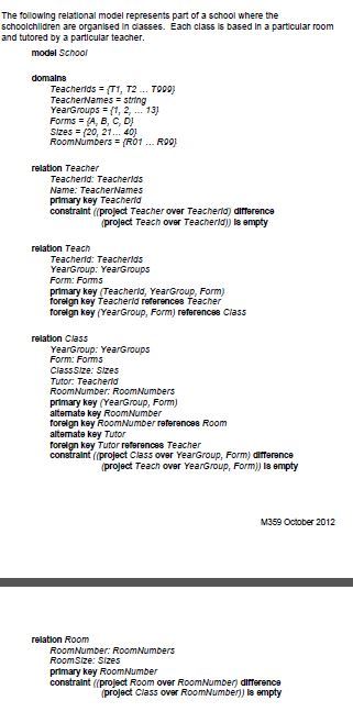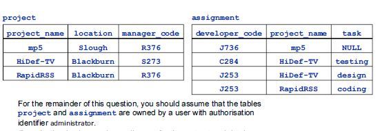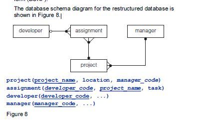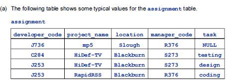 Second, because assignment describes the allocation of developers to projects as well as the projects themselves, no data can be stored about a project before staff have been allocated to it (developer_code cannot be NULL, as it forms part of the primary key for assignment).