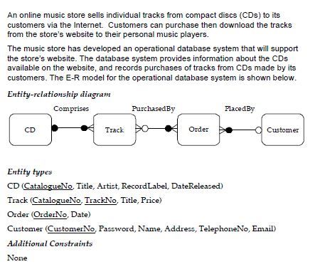Both the CD and Track relation both have within their primary keys Catalogue_No. In the OU material they all seem to have single identifiers, so it may be necessary to create a unique code for each. I still need clarification from my tutor on how to handle these types of questions.