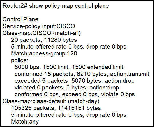 Refer to the exhibit. An engineer configures CoPP and enters the show command to verify the implementation. What is the result of the configuration?