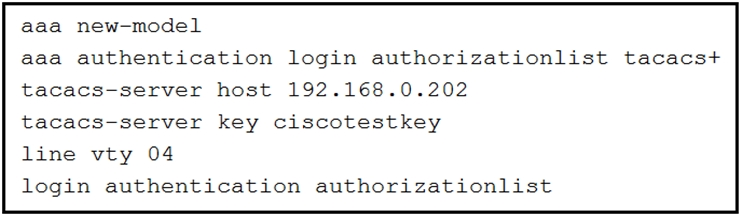 A. The device will allow users at 192.168.0.202 to connect to vty lines 0 through 4 using the password ciscotestkey.