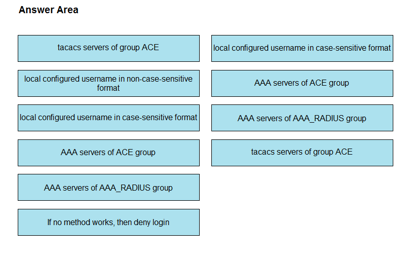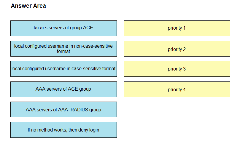 An engineer creates the configuration below. Drag and drop the authentication methods from the left into the order of priority on the right. Not all options are used.