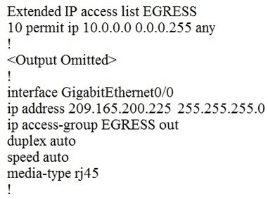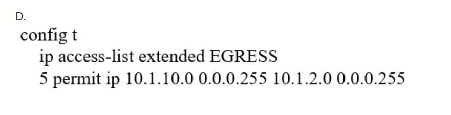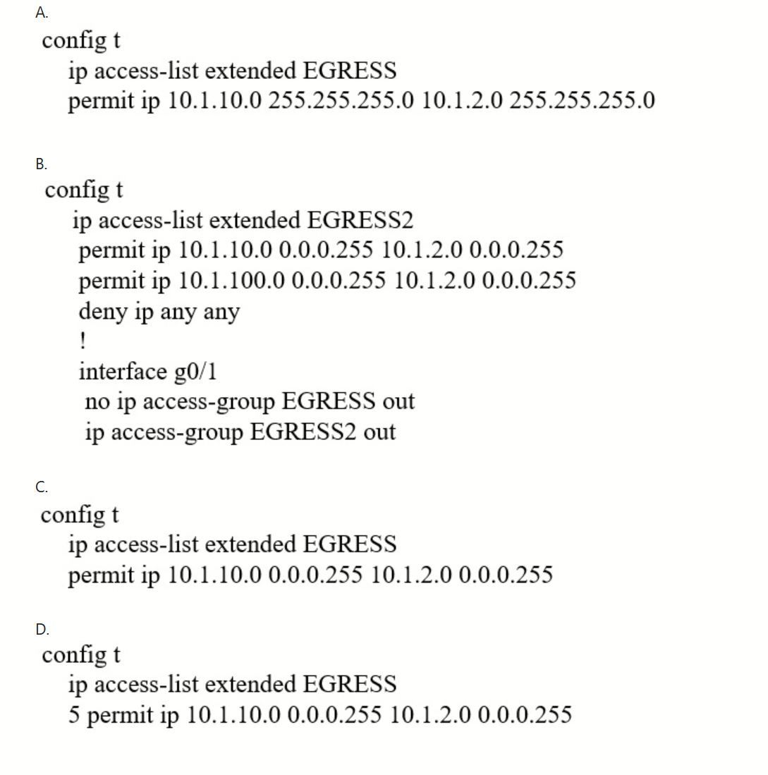 An engineer must modify the access control list EGRESS to allow all IP traffic from subnet 10.1.10.0/24 to 10.1.2.0/24. The access control list is applied in the outbound direction on router interface GigabitEthernet 0/1.