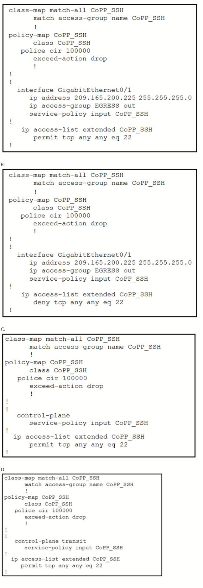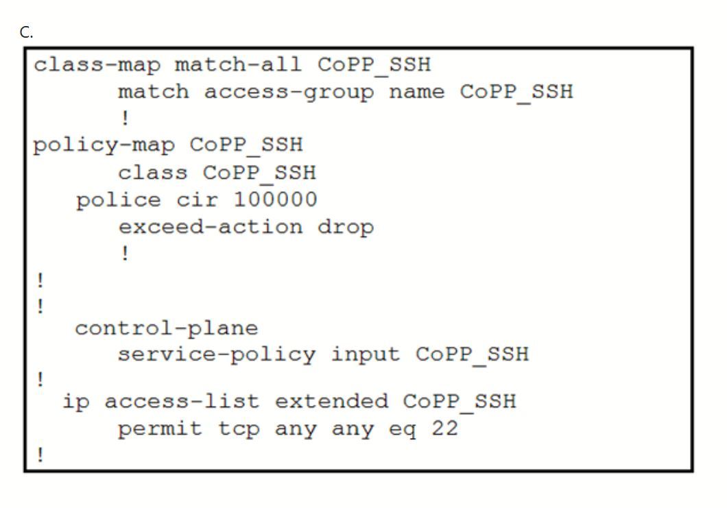 Which configuration restricts the amount of SSH traffic that a router accepts to 100 kbps?