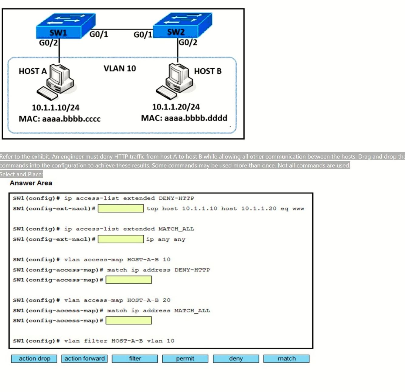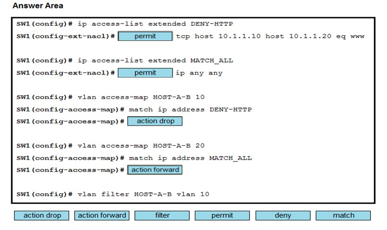 Refer to the exhibit. An engineer must deny HTTP traffic from host A to host B while allowing all other communication between the hosts. Drag and drop the commands into the configuration to achieve these results. Some commands may be used more than once. Not all commands are used.