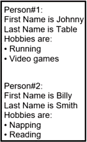 C. {[{ג€˜First Nameג€™: ג€˜Johnnyג€™, ג€˜Last Nameג€™: ג€˜Tableג€™, ג€˜Hobbiesג€™: ג€˜Runningג€™, ג€˜Hobbiesג€™: ג€˜Video gamesג€™}, {ג€˜First Nameג€™: ג€˜Billyג€™, ג€˜Last Nameג€™: ג€˜Smithג€™, ג€˜Hobbiesג€™: ג€˜Nappingג€™, ג€˜Readingג€™}]}