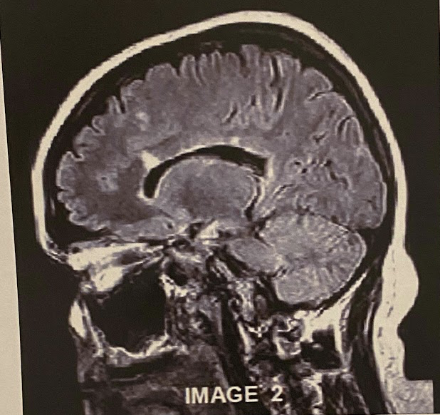 The sagittal scan, demonstrates typical hyper intense tendril-like projections in the corpus callous characteristically seen in patients with what disease?