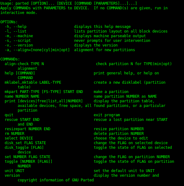 Set unit as the unit to use when displaying locations and sizes. Unit can be: s(sectors), B(bytes), kB, MB, MiB, GB, GiB, TB, TiB, %, cyl, chs(cylinders, heads, sectors), compact.