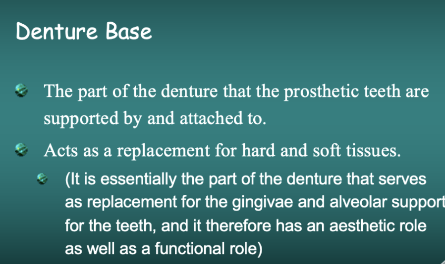 The denture base is that part of the denture that the artificial teeth are connected to. It may also make up the major connector for a denture in the case of all acrylic dentures. (It is essentially the part of the denture that serves as replacement for the gingivae and alveolar support for the teeth, and it therefore has an aesthetic role as well as a functional role, keeping the denture strong and rigid).