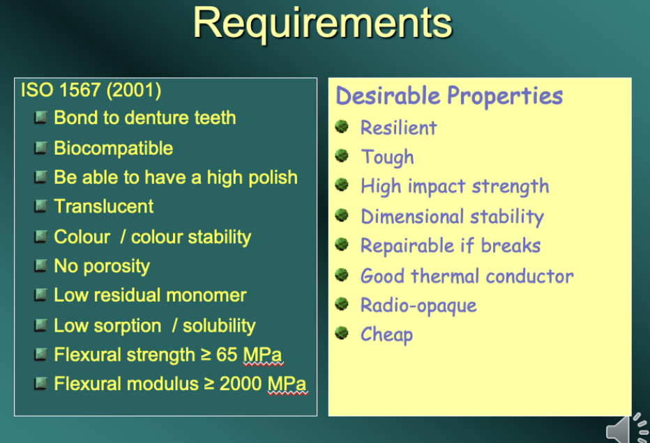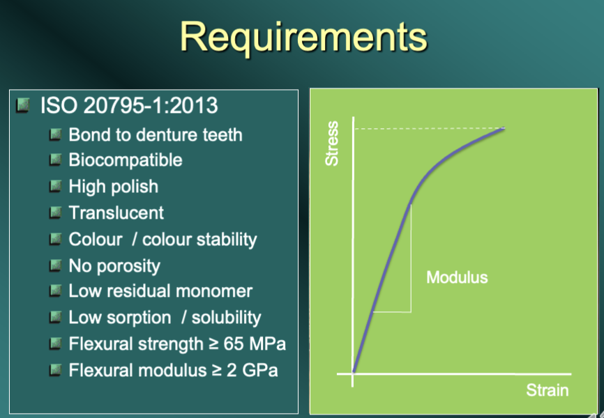 Looking back at the standards however, we can see there are several properties that are not included that would be desirable as well as resilience and toughness. Dentures are frequently dropped, so a high impact strength is desirable, and since dentures frequently break then it would be an advantage if they could be repaired rather than replaced. As dentures frequently cover large surfaces intra-orally then it may be nice if they could conduct heat to give the patient more awareness of what they are about to swallow. Talking of swallowing, small dentures or parts of dentures sometimes are swallowed, or inhaled, and so it would be an advantage if they were made of a material that could be identified on a radiograph