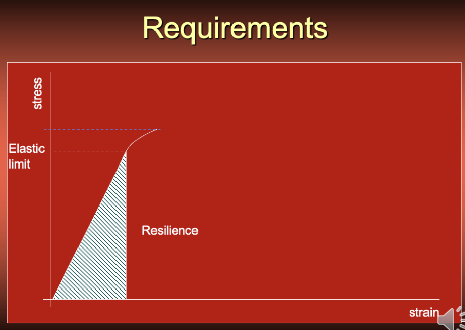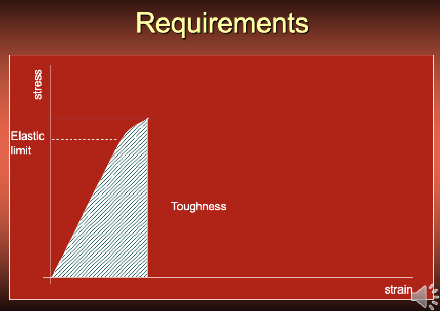 Toughness is the amount of energy absorbed by a material until it breaks. Neither resilience or toughness are included in the standard requirements, however, they are important properties.