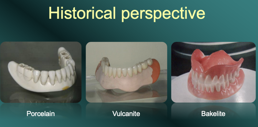 Historically, denture bases have been made from all kinds of materials, including bone, wood and antler. Here are some examples of some of the more successful historical materials. Vulcanite is a highly cross-linked rubber – similar to the material that goes to make car tyres. This doesn’t sound promising, but Vulcanite dentures were the most popular dentures from the 1850s to the 1940s. Bakelite dentures were briefly introduced when Bakelite, as one of the first truly plastic mouldable materials was invented in the early 1900s. Despite looking better than Vulcanite they had poor mechanical properties and so didn’t last long.