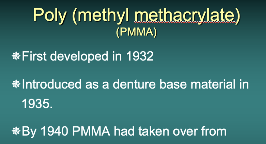 Poly methyl methacrylate was introduced as a denture base material in 1935. Soon denture teeth were made from it also, replacing the porcelain teeth that had been popularised at the time of Vulcanite. The chemistry and properties of PMMA has changed very little since the 1940s, but just how good a denture base material is it?