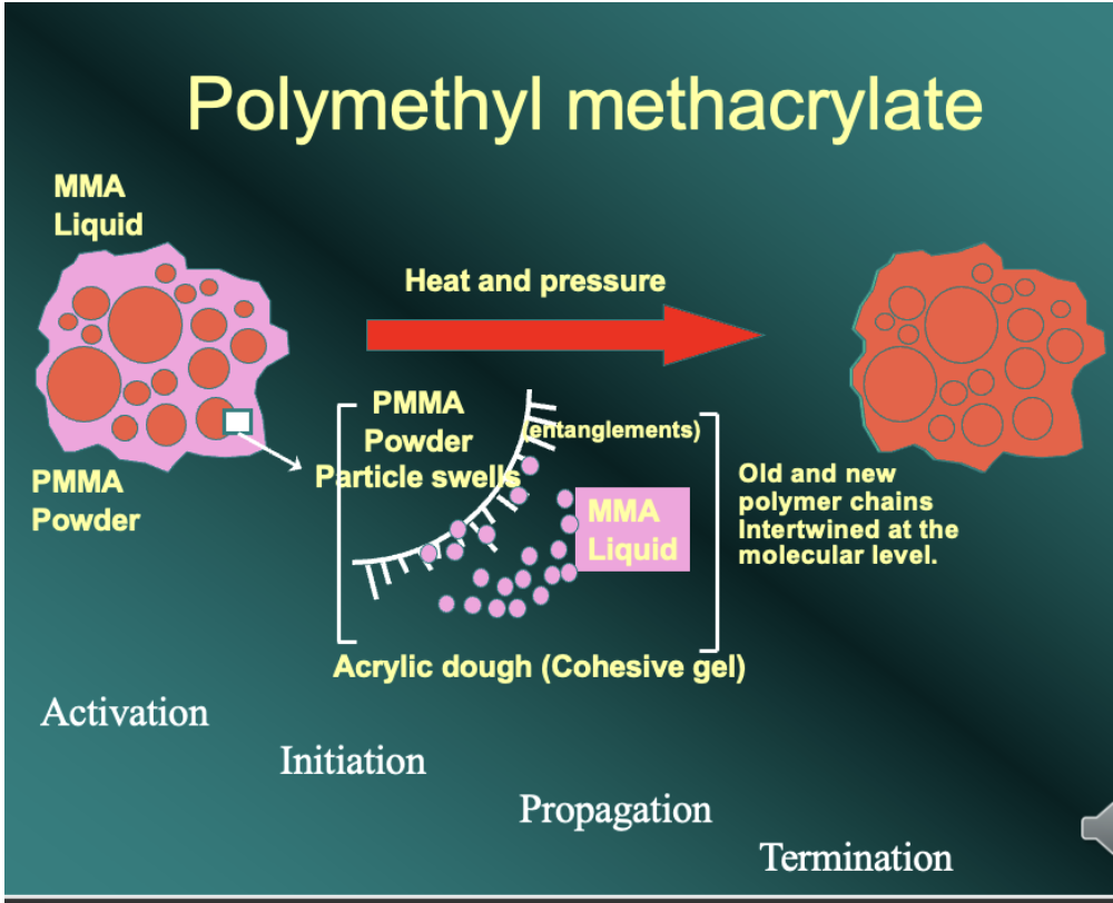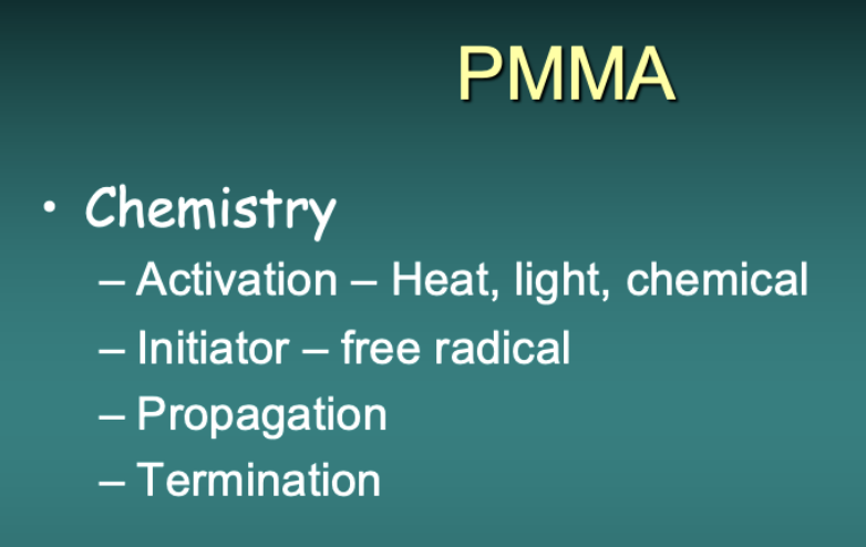 PMMA undergoes addition polymerisation. This involves 4 stages – activation of an initiator – in which a chemical is made to produce a free radical. Initiation is where the free radical starts the polymerisation process by connecting with a monomer molecule. As one monomer attaches to another the reaction is said to propagate, and finally if the growing chain meets another and joins with it, or it doesn’t encounter any more monomer molecules, the reaction terminates.