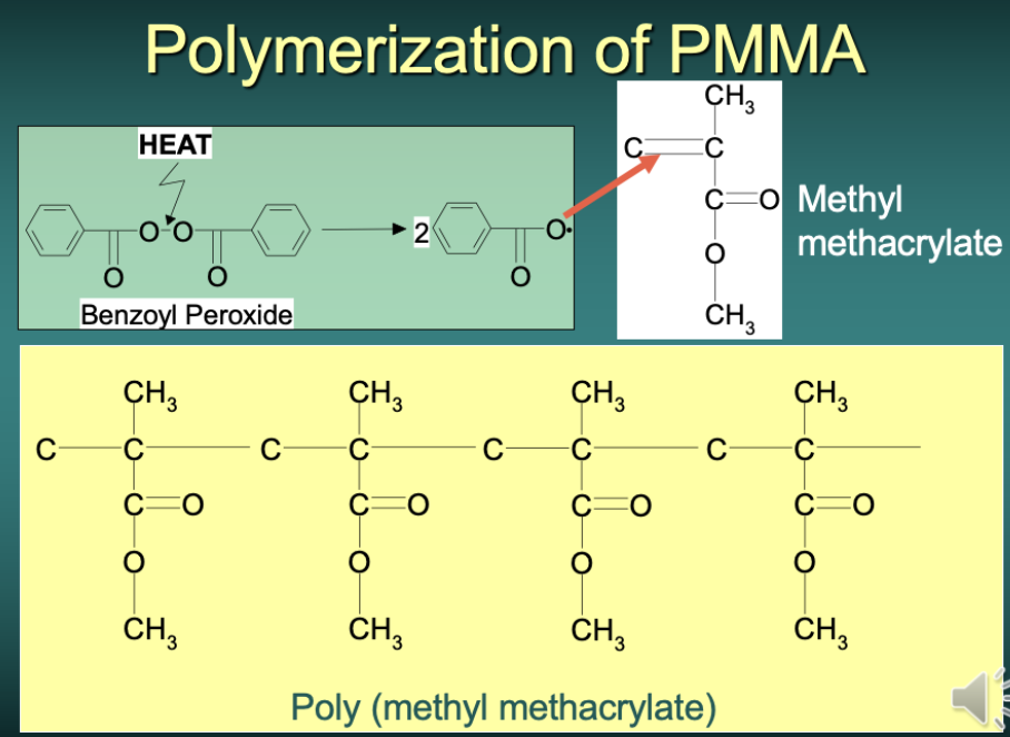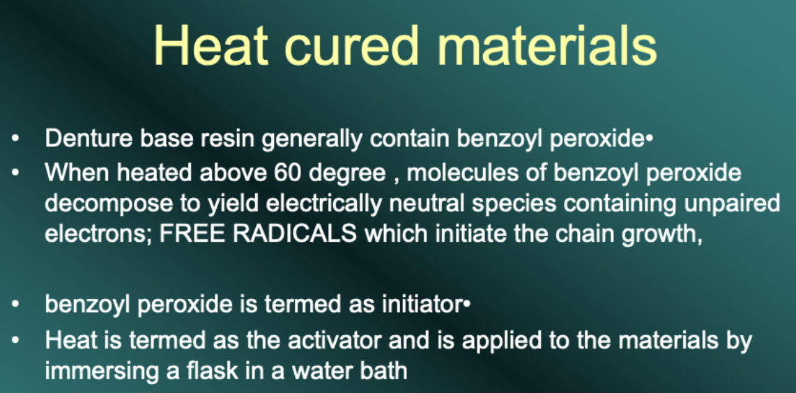 With denture base materials, the most common form of activation is using heat, the initiator molecule is typically benzoyl peroxide, which in the presence of heat breaks down to form a free radical. This is similar tohow camphorquinone breaks down in the presence of blue light when we are looking at composite materials.