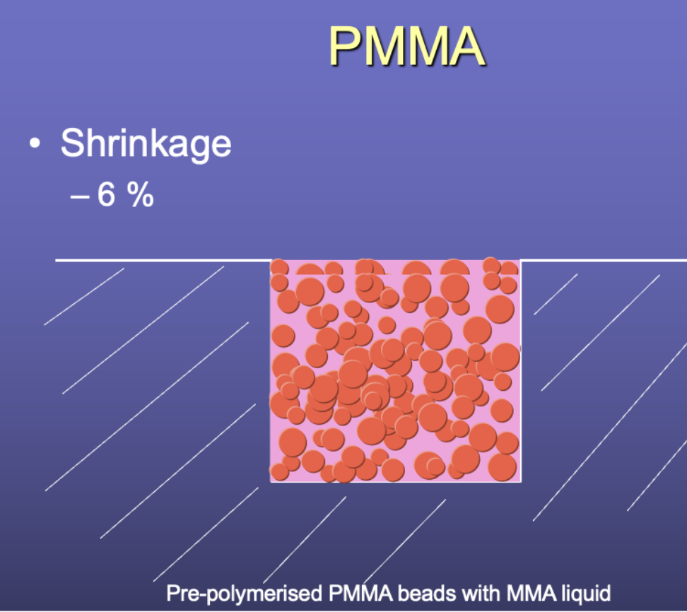 To overcome this problem, we rarely use neat MMA but rather mix it with PMMA beads that are already polymerised. As these don’t undergo any further shrinkage, but take up room from monomer molecules, the net effect is the creation of a material that undergoes only about 6% by volume. Much less than before, but still enough to be a potential problem when we are looking at uses that require a high degree of accuracy