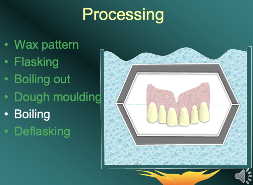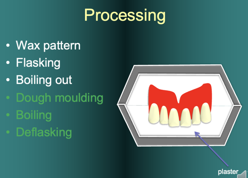 To prevent gaseous porosity from occurring, the MMA must be heated very slowly, so that it has fully solidified before the boiling point is reached. For this reason, the denture processing technique involves at least 4 hours of slow warming up.
