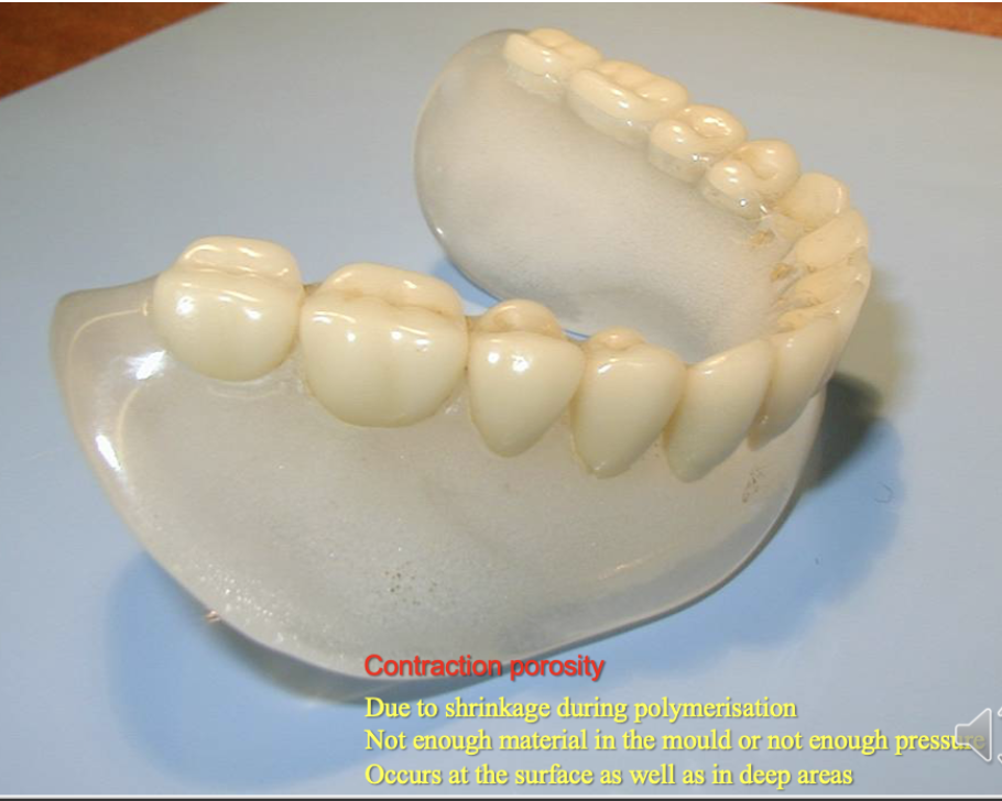 Contraction porosity occurs due to the 6% shrinkage that is inherent in PMMA production. To avoid it happening, a little extra PMMA dough is added to the mould before heating, and the mould is kept under very high pressure throughout the procedure to prevent bubbles from growing in size.