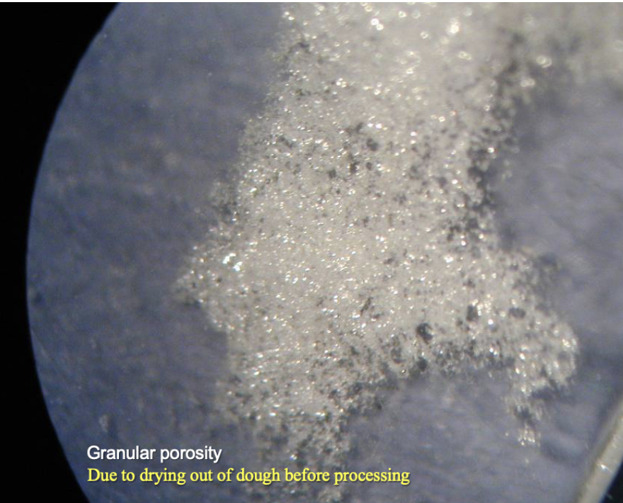 Granular porosity is more rare and is due to the dough becoming dry before processing
