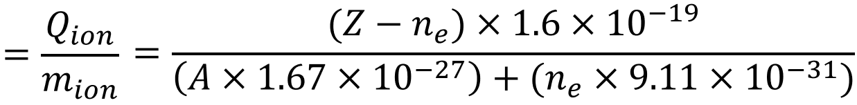 Charge of the ion (Protons - Electrons) divided by total mass of ion