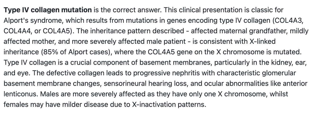 A 14-year-old boy presents with microscopic haematuria detected during a school health screening. His maternal grandfather developed end-stage renal failure in his twenties and required dialysis. His mother has mild hearing difficulties but normal renal function. Audiometry reveals bilateral high-frequency sensorineural hearing loss. Ophthalmological examination shows anterior lenticonus.