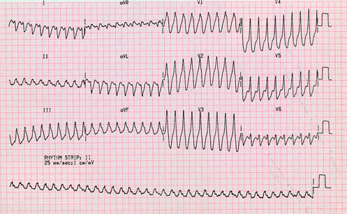 The ECG displays a wide-complex tachycardia consistent with ventricular tachycardia (VT). The differential diagnosis is a supraventricular tachycardia with bundle branch block. Management of VT depends on the haemodynamic status of the patient. If the patient is haemodynamically compromised, then emergency DC cardioversion must be considered first, which is the correct management choice for this patient.