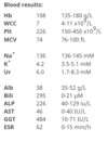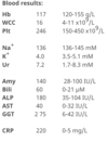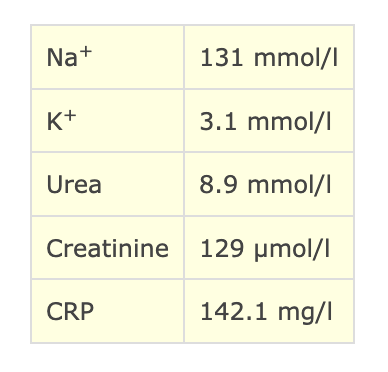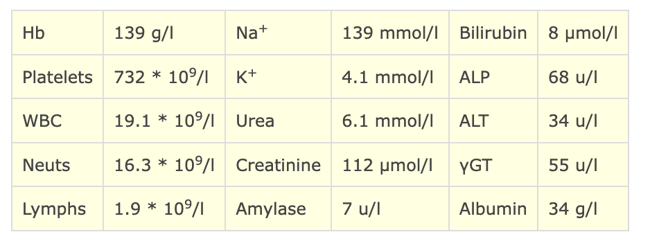 Hb139 g/lNa+139 mmol/lBilirubin8 µmol/lPlatelets732 * 109/lK+4.1 mmol/lALP68 u/lWBC19.1 * 109/lUrea6.1 mmol/lALT34 u/lNeuts16.3 * 109/lCreatinine112 µmol/lγGT55 u/lLymphs1.9 * 109/lAmylase7 u/lAlbumin34 g/l