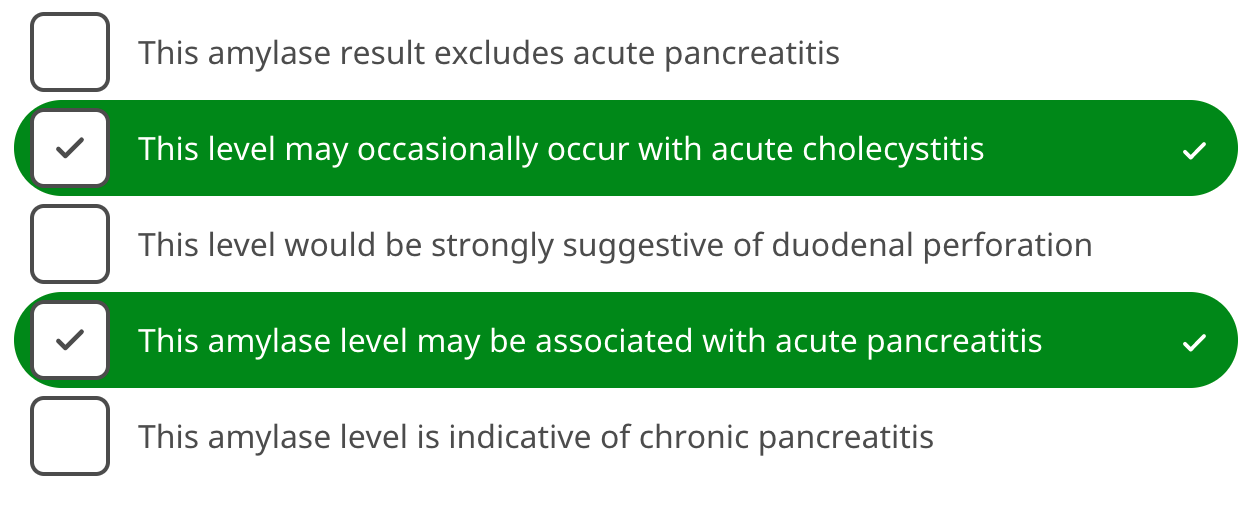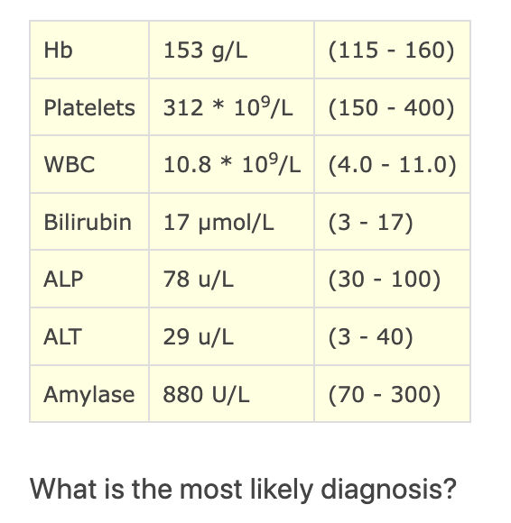 In acute pancreatitis the amylase level may be very high (>1000 U/ml). If the pancreatitis has been going on for a few days the level may drop however and moderate elevation may also be seen occasionally in other conditions e.g. duodenal perforation, mesenteric infarction, acute cholecystitis.