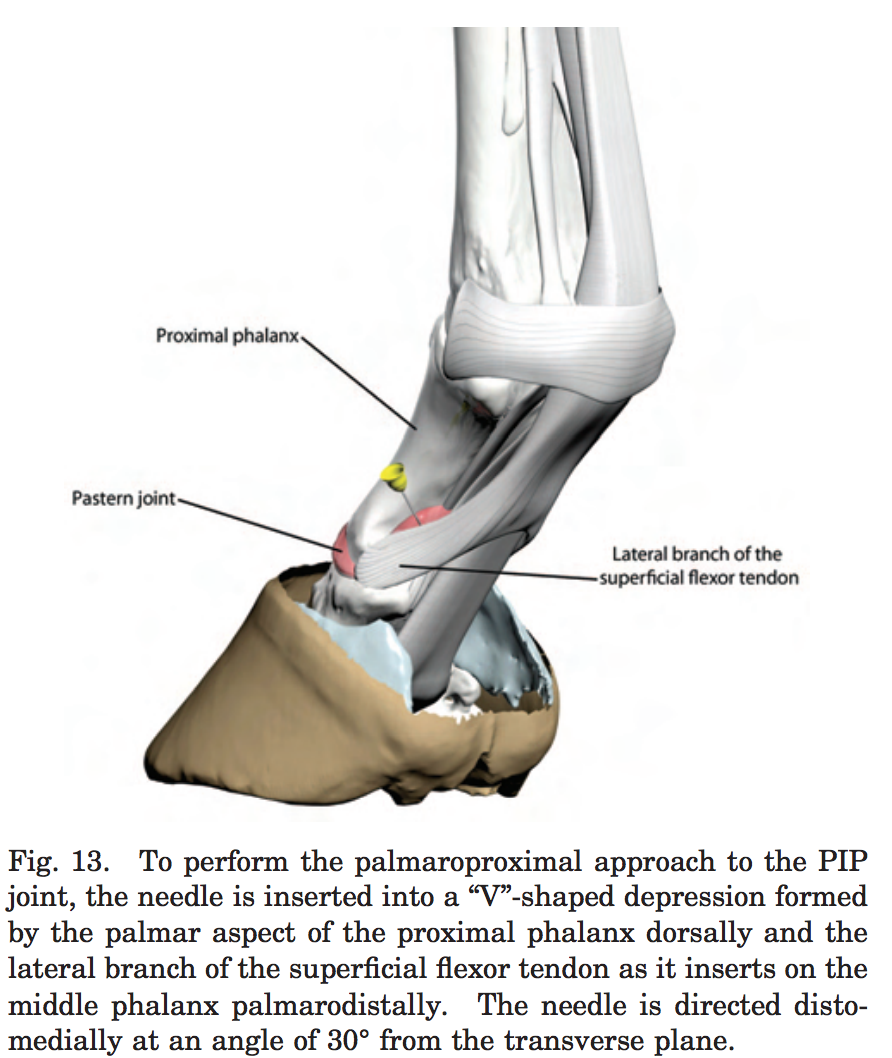 Needle is inserted into a “V”-shaped depression formed by the palmar aspect of the P1 dorsally and the lateral branch of the SDF as it inserts on the middle phalanx palmarodistally. The needle is directed distomedially at an angle of 30° from the transverse plane
