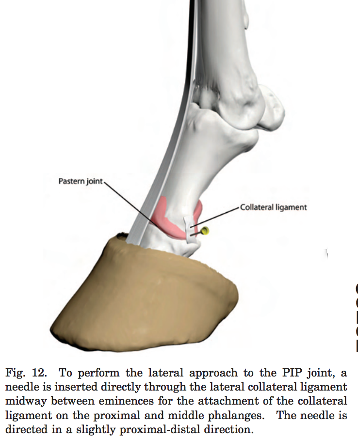 Needle inserted directly through the lateral collateral ligament midway between the eminences for the attachment of the collateral ligament on the proximal and middle phalanges. The needle is directed in a slightly proximal to distal direction