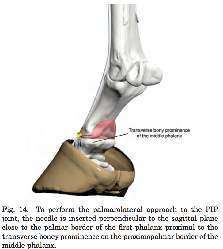 The site of needle insertion is immediately proximal to the transverse bony prominence on the proximopalmar border of the middle phalanx. The needle is inserted perpendicular to the sagittal plane close to the palmar border of the proximal phalanx